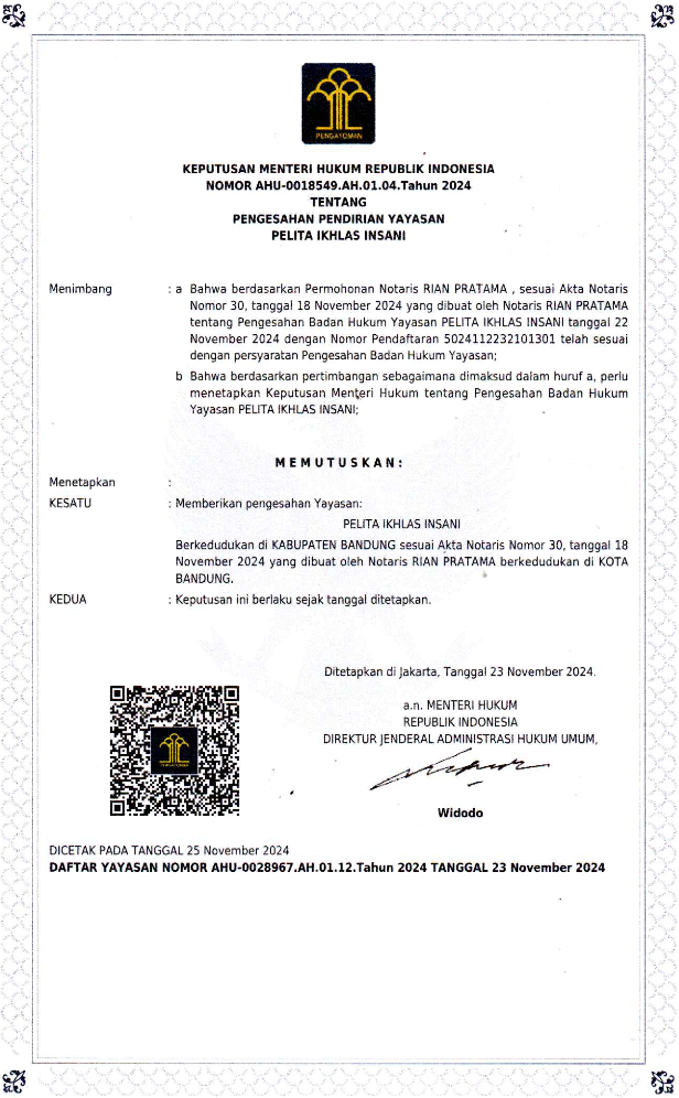 Hingga awal tahun 2024, kepemimpinan Dewan Kemakmuran Masjid (DKM) dipegang oleh H. Encep Suhendi, S.Pd., dan kemudian dilanjutkan oleh Saefudin Zuhri, ST hingga saat ini. Dalam upaya memperkuat legalitas dan kelembagaan, pada tanggal 18 November 2024 secara resmi dibentuk Yayasan Pelita Ikhlas Insani (YPII) sebagai wadah formal yang menaungi seluruh aktivitas masjid. Yayasan ini berdiri berdasarkan Akta Pendirian No. 30 oleh Notaris Rian Pratama, S.H., M.Kn., serta disahkan melalui SK Kementerian Hukum dan HAM Republik Indonesia Nomor: AHU-0018549.AH.01.04 Tahun 2024.